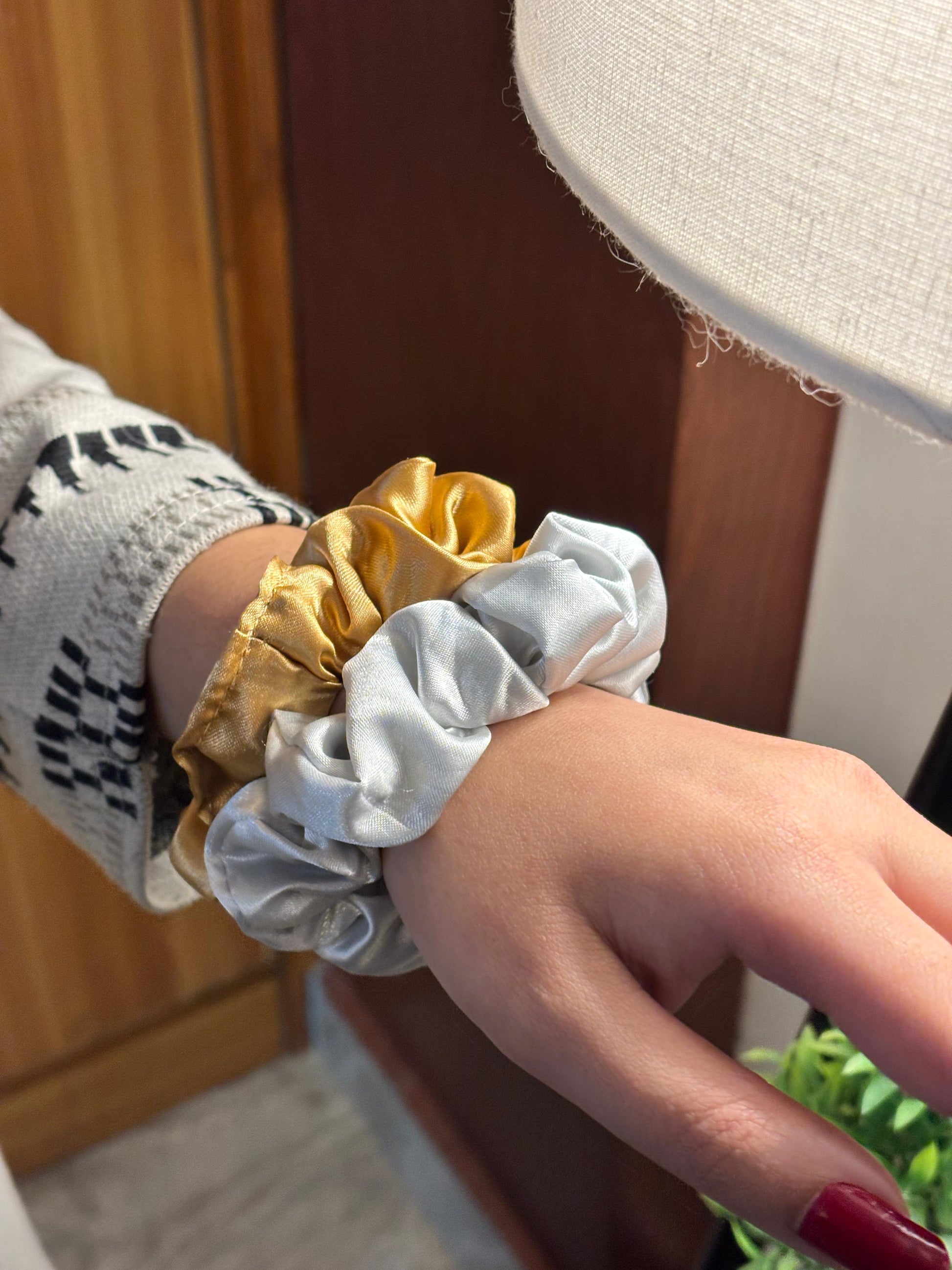 - Silver satin scrunchie – Soft satin scrunchie in a classy silver shade.