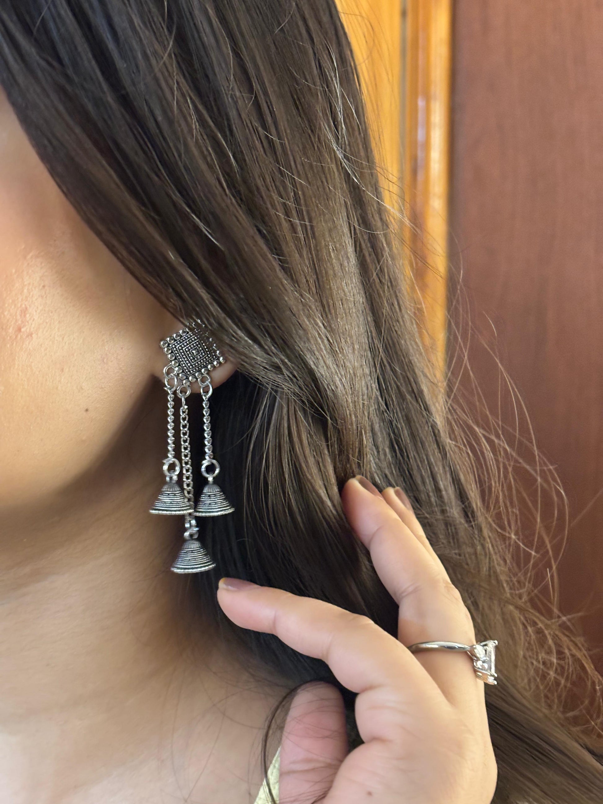 - Silver square & chain jhumka earrings – Square stone stud with chain-linked mini jhumkas and oxidised detailing.