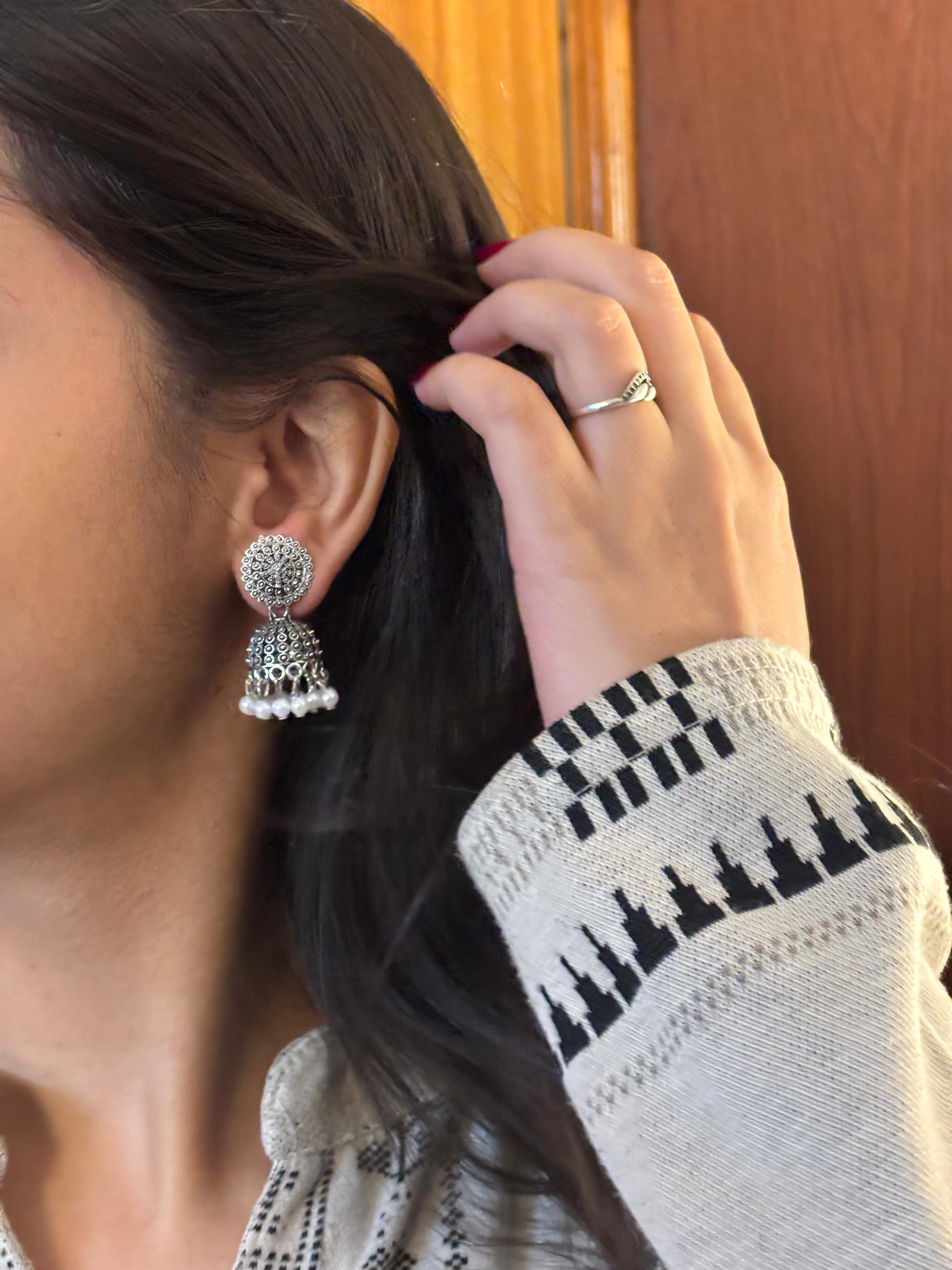 - Silver round kundan jhumka earrings – Circular stud with intricate dome jhumka and pearl drop detailing.
